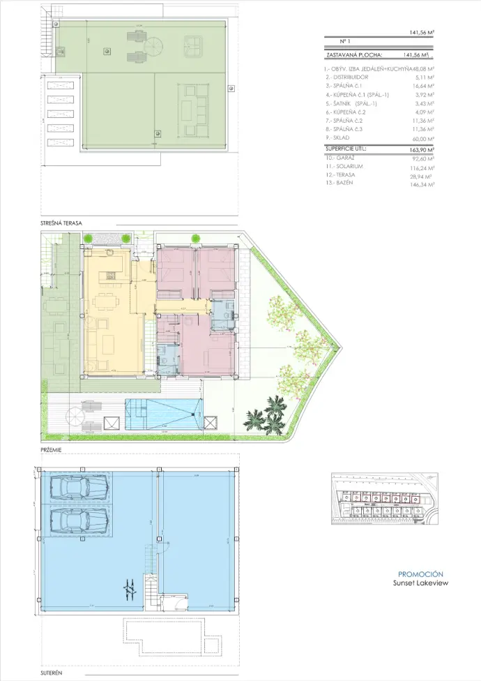 Každá vila disponuje úžitkovou plochou 141 m², ktorá zahŕňa veľkorysý otvorený denný priestor spájajúci obývačku s jedálňou, harmonicky prepojený s kompletne zariadednou kuchyňou. Súčasťou nehnuteľnosti jsou tri komfortné spálne a dve štýlové kúpeľne. Rodičovská spálňa je vybavená súkromnou kúpeľňou a priestrannou šatňou, kým ďalšie dve spálne ponúkajú vstavané úložné priestory a bezprostredný výstup do záhrady.